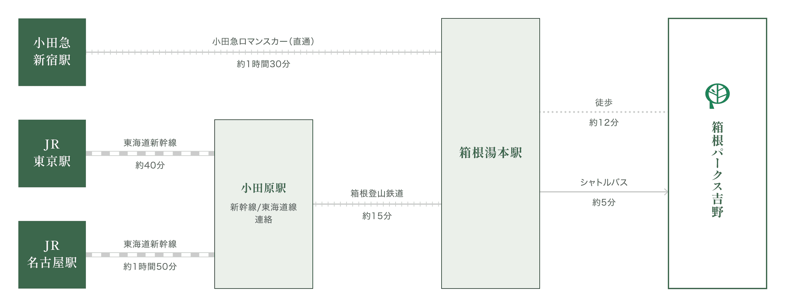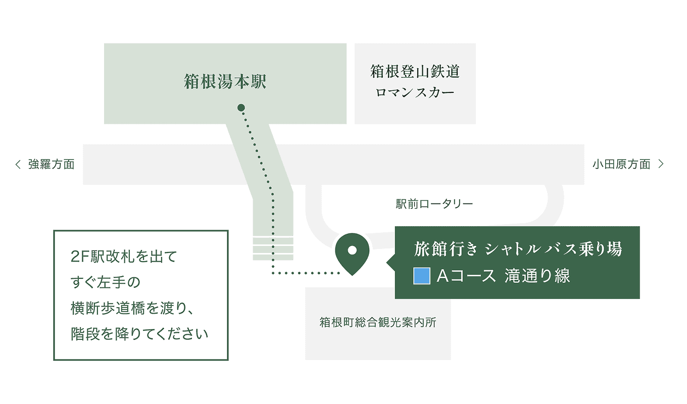 箱根湯本駅前ロータリーの観光案内所前より、当館まで所要約5分のシャトルバスが運行しております。