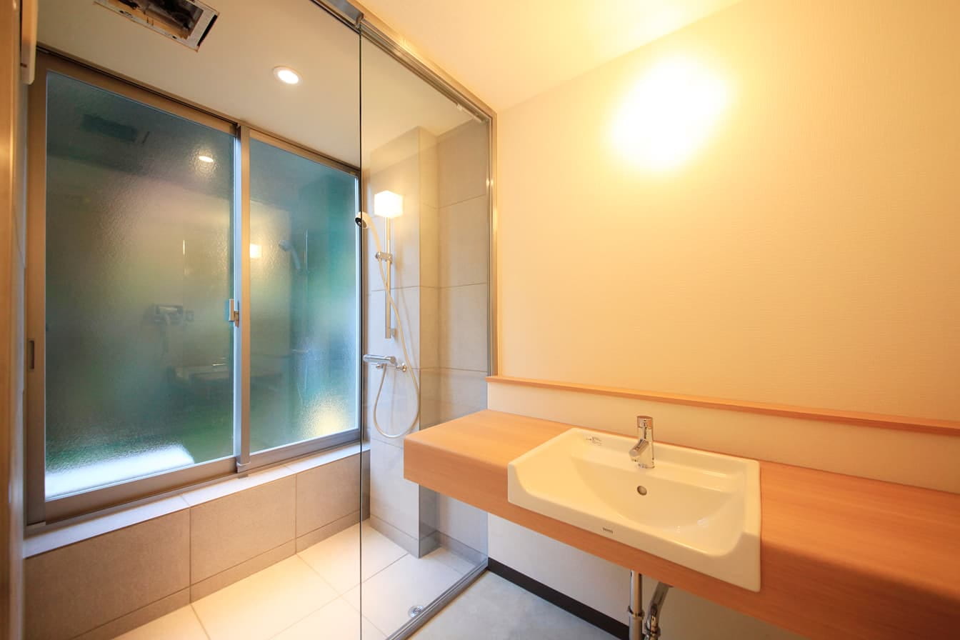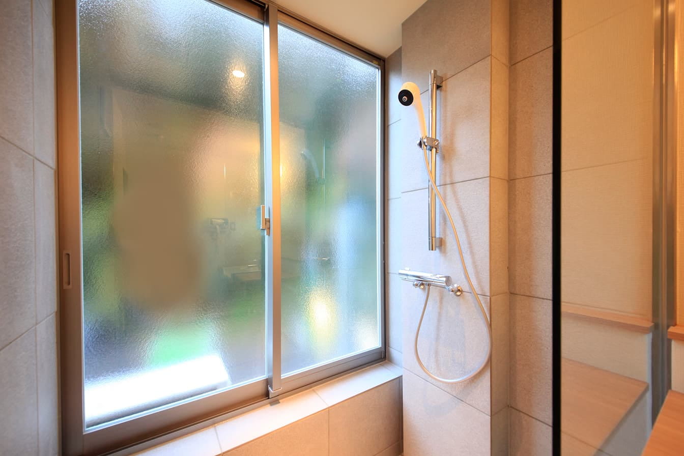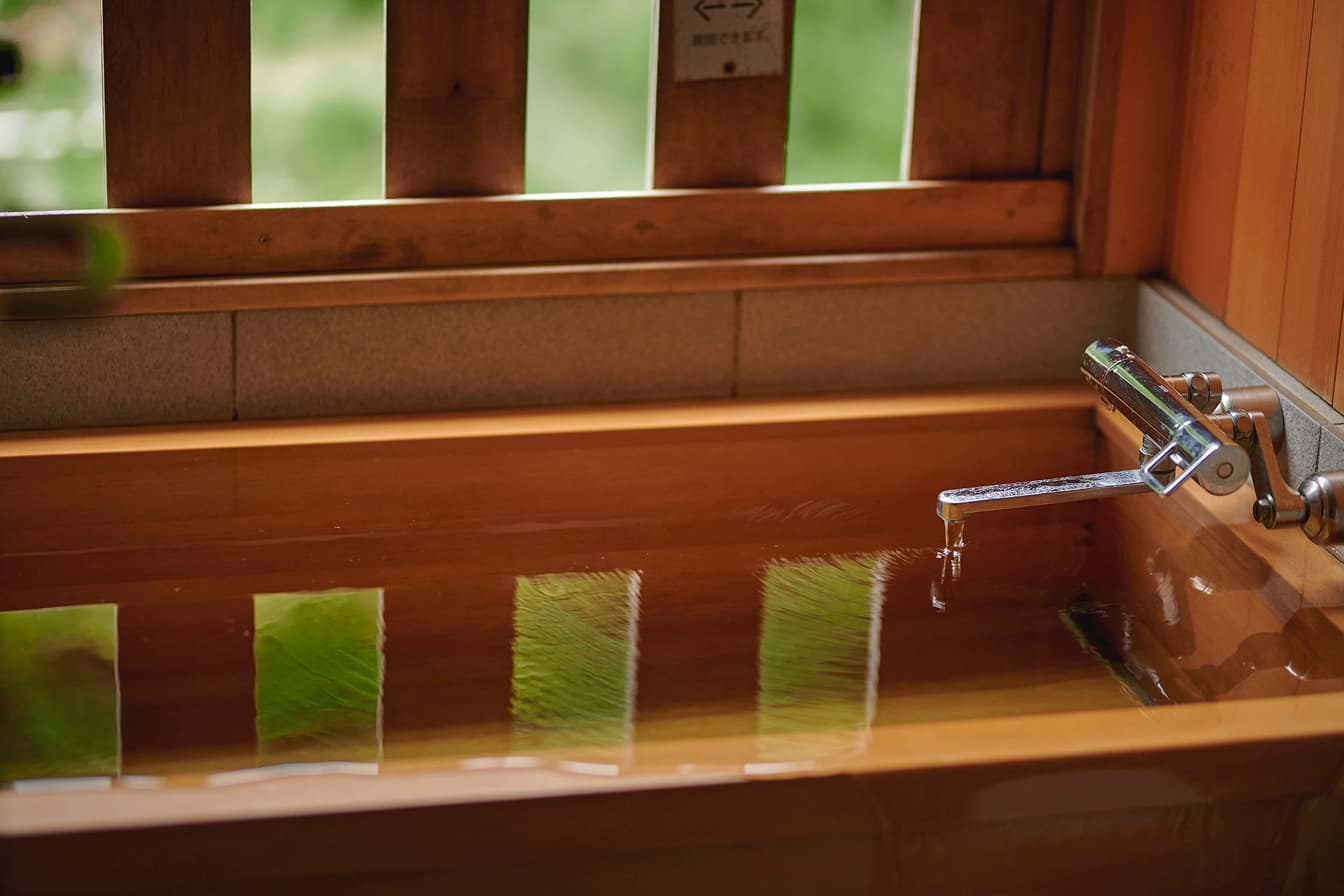 温泉を引いたシャワーブースで気軽に湯浴みし