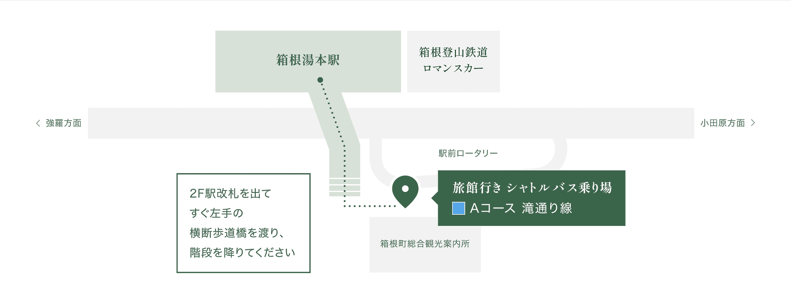 箱根湯本駅前ロータリーの観光案内所前より、当館まで所要約5分のシャトルバスが運行しております。