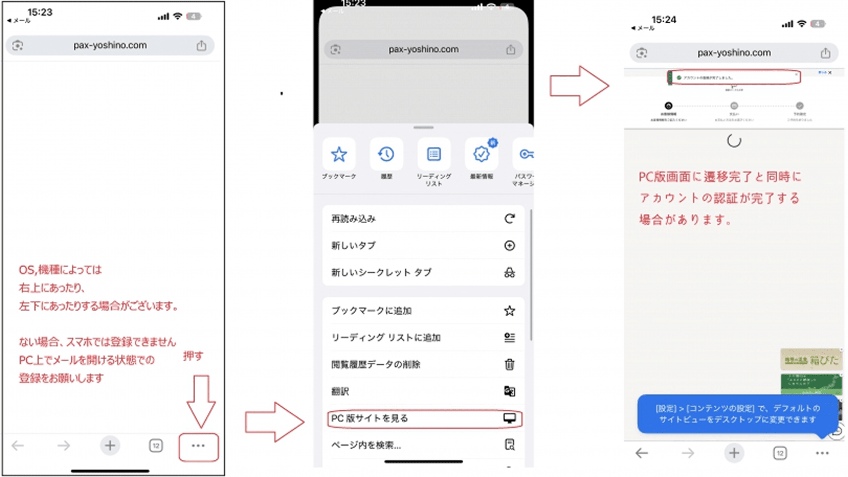 次の画面でPC画面に遷移し、会員登録が完了する場合がございます。
