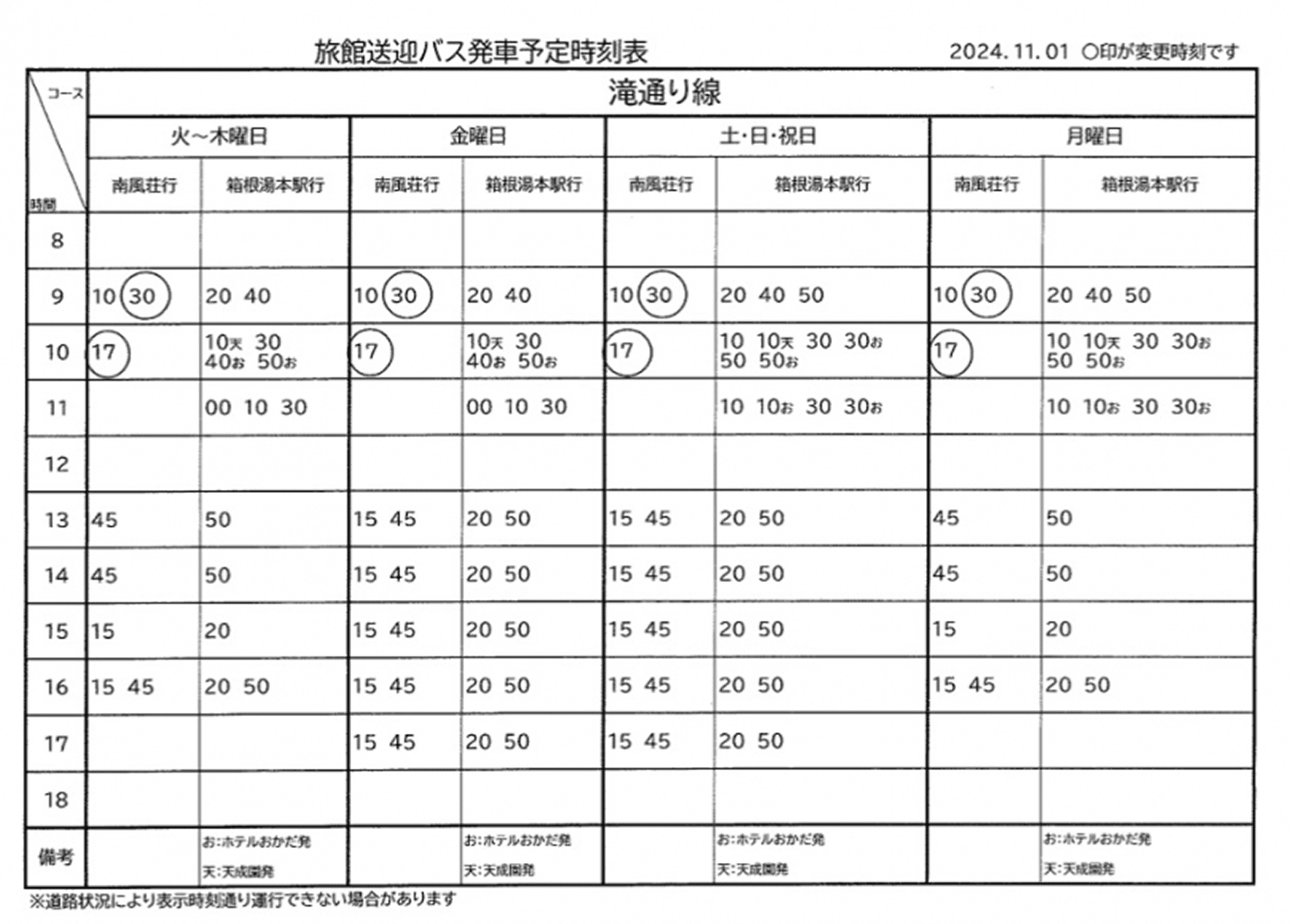 箱根湯本温泉シャトルバス時刻表/Shuttle bus timetable. Last updated: 01NOV2024