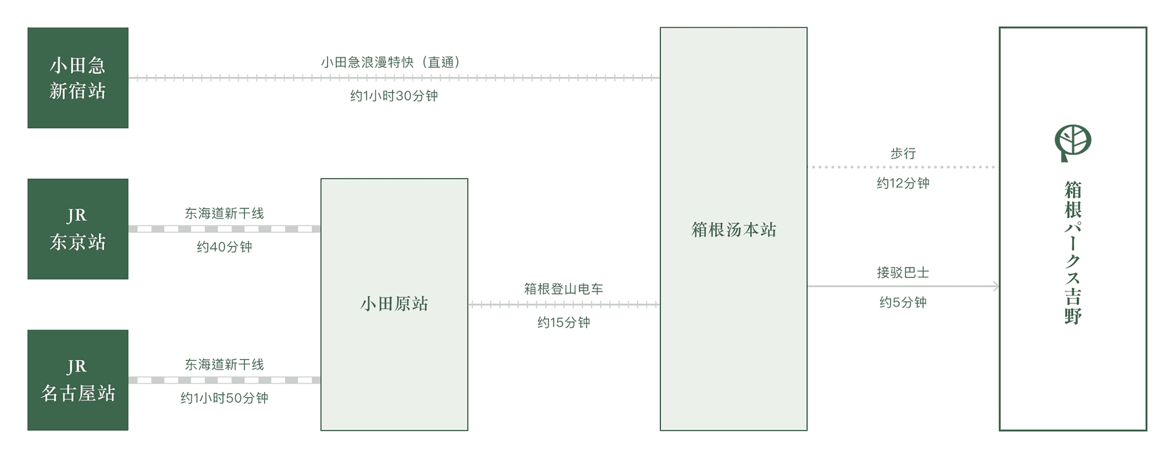 从箱根汤本车站前广场的游客中心出发,接驳巴士约需5分钟车程。